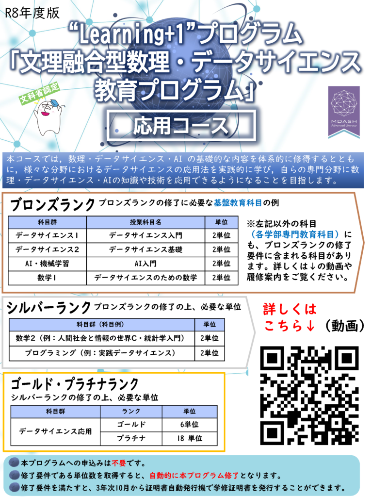 - 「プラチナランク」:シルバーランク修了の上,データサイエンス応用の科目群から加えて18単位を修得すること。