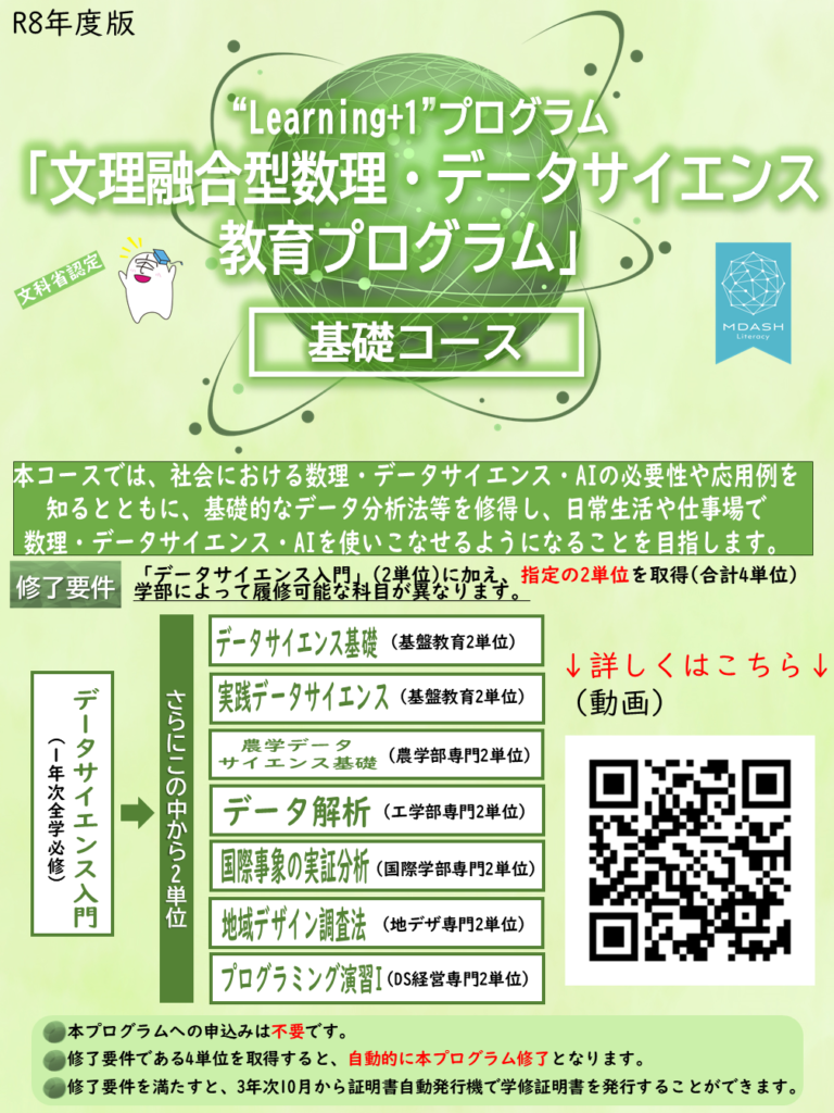 - 選択科目※1:データサイエンス基礎(2単位),実践データサイエンス(2単位),プログラミング演習1(2単位,データサイエンス経営学部),国際事象の実証分析※2(2単位,国際学部),地域デザイン調査法(2単位,地域デザイン科学部),データ解析(2単位,工学部),農学データサイエンス基礎※3(2単位,農学部)