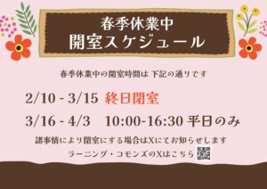 春季休業期間中のラーニング・コモンズのスケジュールは以下の通りです。